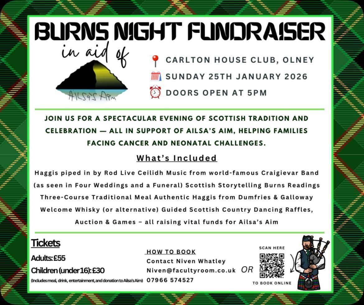 Join us for a spectacular evening of Scottish tradition, laughter, and celebration — all in support of Ailsa’s Aim, helping families facing cancer and neonatal challenges 💚